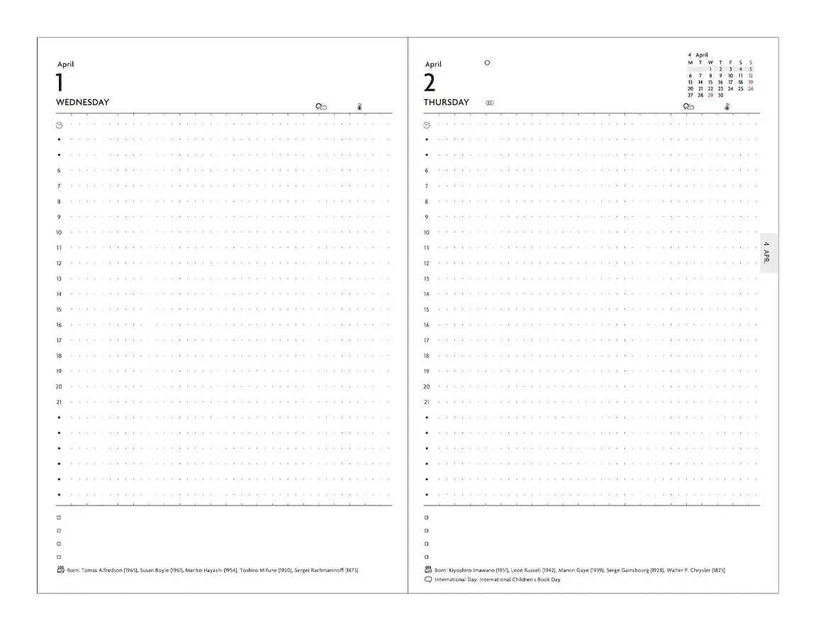 スケジュールやメモ・日記がたっぷり書ける1日2ページの手帳が新登場!24時間のバーチカル軸や天気のアイコンが付いています。薄くて軽い軽量紙「トモエリバーS」を使用しているので、ページ数が多いながらも軽くてコンパクトな作りとなっています。