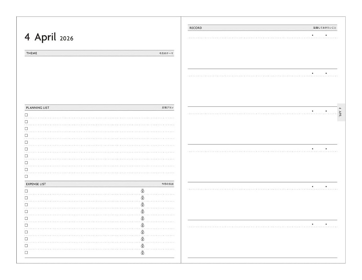• 見開き4ヶ月の月間ページ