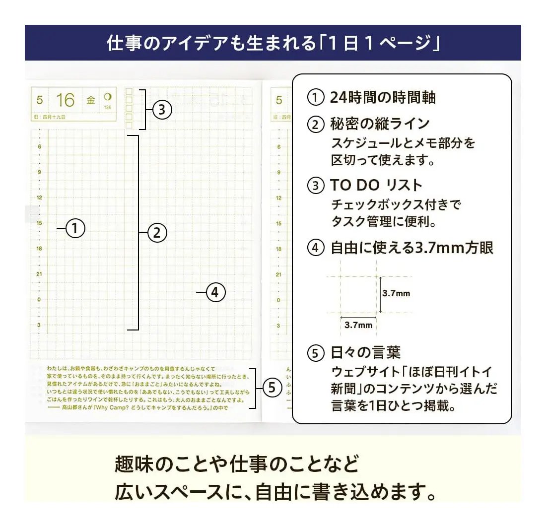 ほぼ日手帳と並んで人気の高い手帳です。ドット罫線と縦に線が引けるガイドポイントで、ページを自由に分割できます。年間プランニングページや月ごとの目標を書き込める月間プランニングページなど他の手帳にはないユニークなページが付いているので、しっかりと予定を計画したい人にぴったりです。