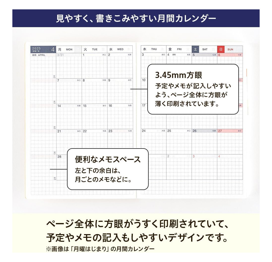 とてもシンプルで、予定もメモも書きやすいデザインとなっています。線を引くのに便利な小さいドットが付いていたり、月間カレンダーでは予定を分けて書けるように線が引かれていたりと、細かいところに気配りを感じます。コンパクトな文庫本サイズは持ち運びがしやすいです。