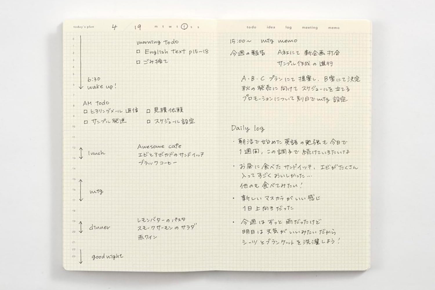 こちらもラコニックの手帳ですが、デイリーページでは、天気や体温・気温、食事メニューを記録する欄があり、To Doのチェックボックス付きの5ミリ方眼メモが付いています。