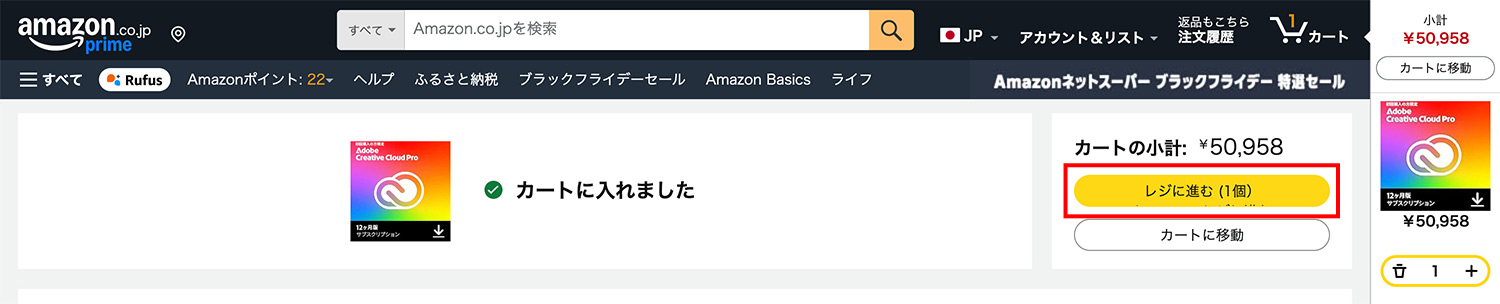 AmazonのAdobe CCのページへ行き、通常の買い物と同じようにカートに入れます。